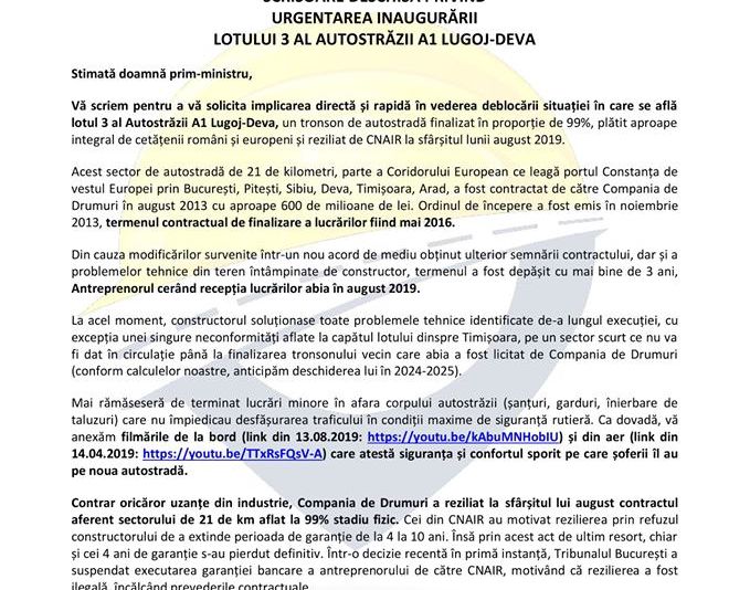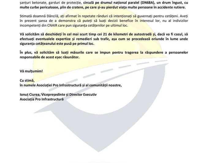Asociaţia „Pro Infrastructură” a transmis premierului Viorica Dăncilă o scrisoare deschisă prin care solicită deschiderea celor 21 de kilometri de autostradă, între Ilia şi Holdea. Reprezentanţii asociaţiei îi mai cer prim-ministrului României să sancţioneze pe cei responsabili cu acest „dezastru”.