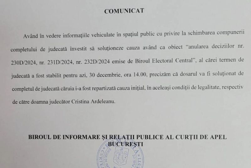 Reacția instanței ne arată că la ora 14.00 - puțin peste o oră - îl vom vedea pe Călin Georgescu în fața aceluiași complet de judecată, unde a fost repartizat inițial procesul.