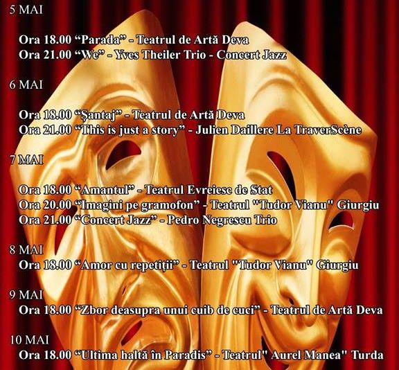În cadrul festivalului vor fi prezentate spectacole realizate de Teatrul Național Satiricus „I.L. Caragiale” din Chișinău, Teatrul Evreiesc de Stat, Teatrul „Tudor Vianu” din Giurgiu, Teatrul „Aurel Manea” din Turda și Teatrul de Artă din Deva. Evenimentul se va bucura de participarea Compagnie Azacusca Franța, Pedro Negresco Trio și Yves Theiler Trio. Biletele au fost puse deja în vânzare la Agenția Teatrală din Deva, la prețul de 35 lei /15 lei reducere. Abonamentul pentru toate spectacolele din festival este 150 lei.