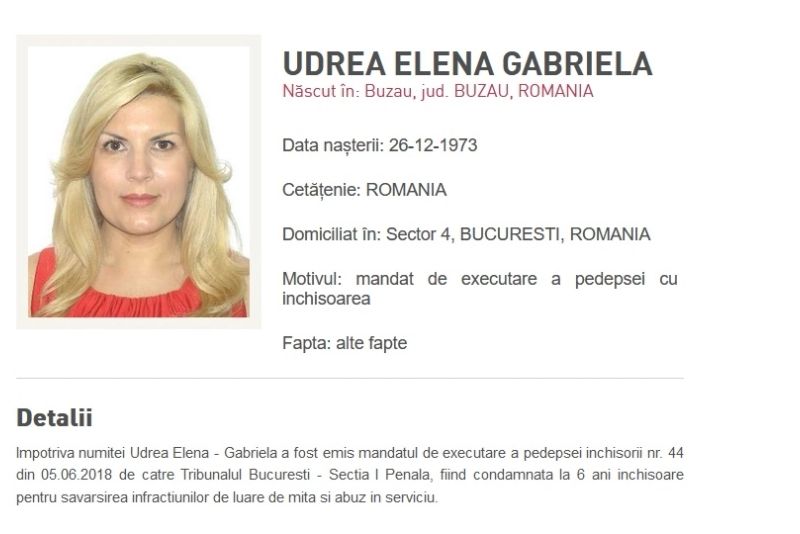 Împotriva numitei Udrea Elena Gabriela a fost emis mandatul de executare a pedepsei închisorii nr. 44 din 05.06.2018 de către Tribunalul București - Secția I Penală, fiind condamnată la 6 ani închisoare pentru săvârșirea infracțiunilor de luare de mită și abuz în serviciu.