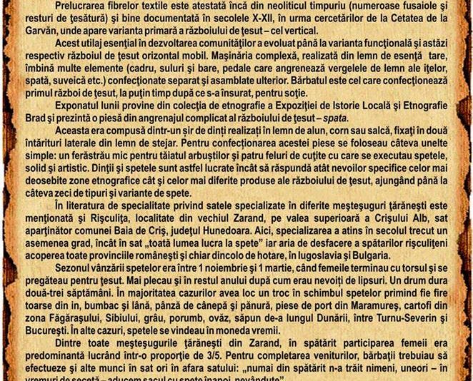 Exponatul lunii ianuarie 2019 provine din colecţia de etnografie a Expoziţiei de Istorie Locală şi Etnografie Brad şi prezintă o piesă din angrenajul complicat al războiului de ţesut – spata. Aceasta era compusă dintr-un șir de dinți realizați în lemn de alun, corn sau salcă, fixaţi în două întărituri laterale din lemn de stejar.