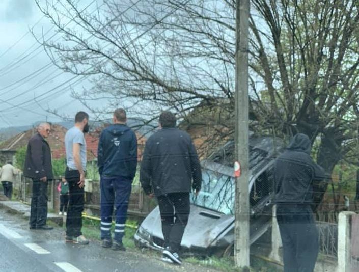 Maşina, marca BMW, a ieşit de pe şosea şi a rămas înfiptă în gardul unei casei şi într-un copac.