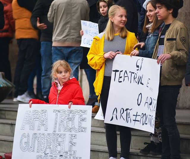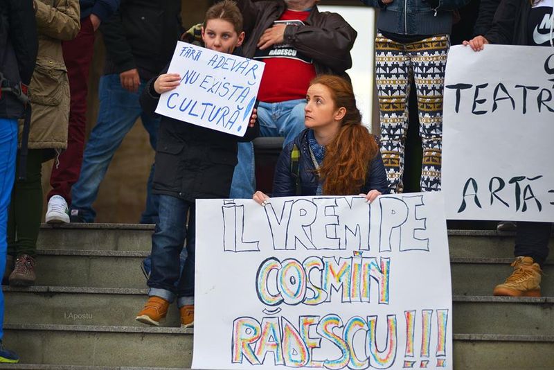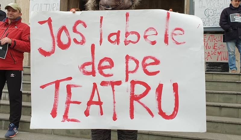 Reuniţi pe treptele instituţiei culturale, actorii au purtat pancarte mari pe care au scris doleanţele lor: „Jos labele de pe teatru!”, „Apa trece, gunoaiele rămân!”, „Teatrul nu este vacă de muls” sau „Liderul nostru e Cosmin Rădescu”.