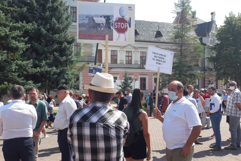 Câteva zeci de locuitori ai municipiului Orăștie s-au adunat, astăzi, în fața sediului Prefecturii Hunedoara din Deva, unde au protestat față de mirosul de dejecții porcine care le-a învăluit orașul. Cu măști chirurgicale pe fețe și cu pancarte pe care scria „Stop, mirosului!” sau „Vrem sprijin reciproc, nu miros de porc!”, oamenii au protestat pașnic.