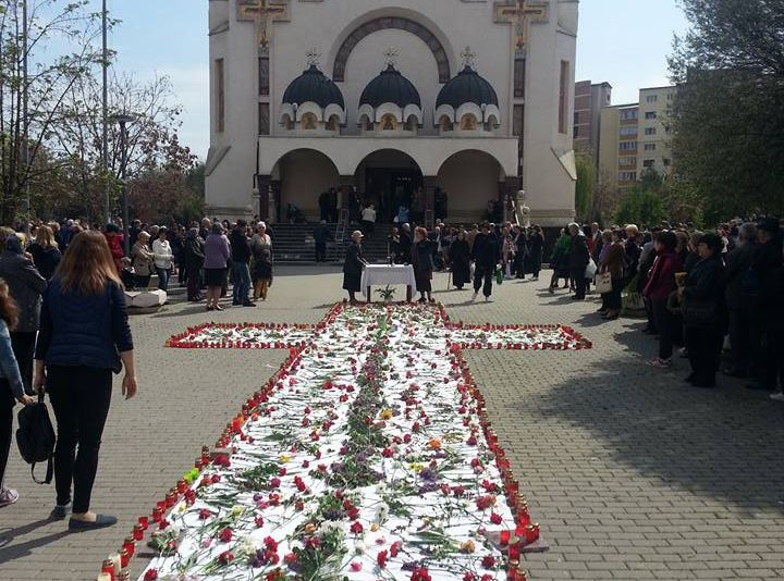 Tradiţie respectată la Hunedoara, acolo unde, astăzi, de Florii, locuitorii au realizat o cruce uriaşă din flori multicolore.
