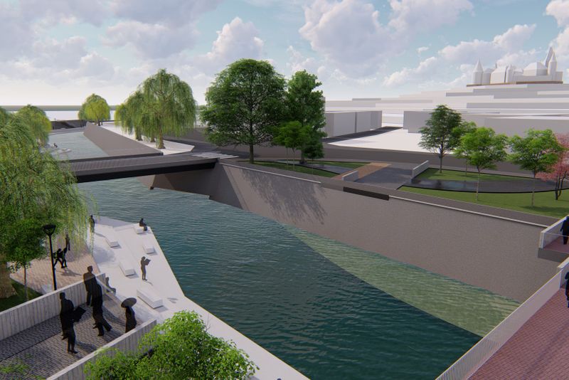 • Amenajare albie prin recalibrare pe o lungime de 585 de metri;• Lucrări de ecologizare și salubrizare;• Defrișarea vegetației din zona albiei minore, Consolidarea malurilorși a zidurilor de sprijin;• Amenajare promenadă, pe malul drept al râului, cu spații verziînierbate și gradene din beton cu locuri de stat în apropierea apeicurgătoare;• Transformarea albiei râului într-un spațiu destinat publicului șifolosirea acestei zone pentru relaxare și agrement;• Aplicare mobilier urban: bănci, coșuri de gunoi, jardiniere stradale,corpuri de iluminat, cișmele;• Propunerea unei noi rețele de iluminat stradal de-a lungul porțiuniiamenajate, pentru crearea unui ambient plăcut;• Crearea de accese în albia minoră a râului;• Montarea de platforme mobile pentru persoanele cu dizabilități în zonele scărilor propuse.