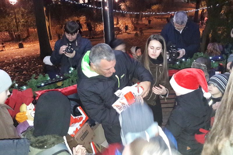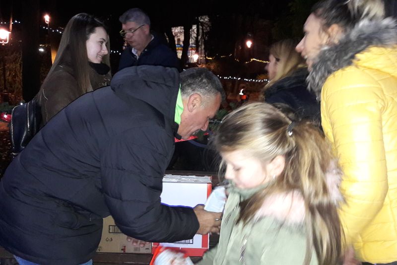 Copii, tineri, dar şi bunici s-au distrat pe gheaţă. Şi pentru că este o seară specială, seara de Ajun de Moş Nicolae, toţi micuţii prezenţi au primit pachete cu dulciuri oferite de primarul municipiului, Florin Oancea.