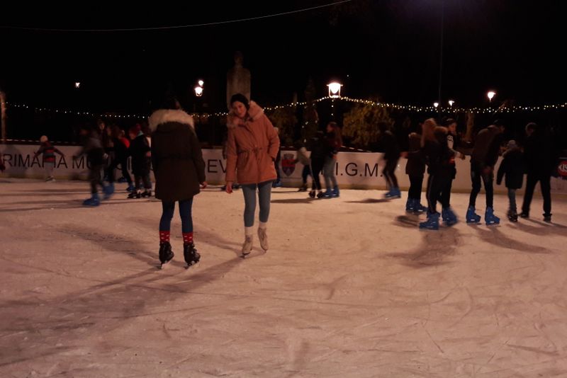 Atmosfera de sărbători a cuprins parcul central al Devei. Zeci de deveni au luat cu asalt, în această seară, patinoarul artificial amenajat acolo de municipalitate.