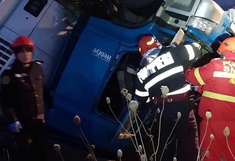 A fost nevoie de intervenţia pompierilor de la descarcerare pentru a-l scoate din cabina zdrobită a autotrenului. Din nefericire, bărbatul a decedat.