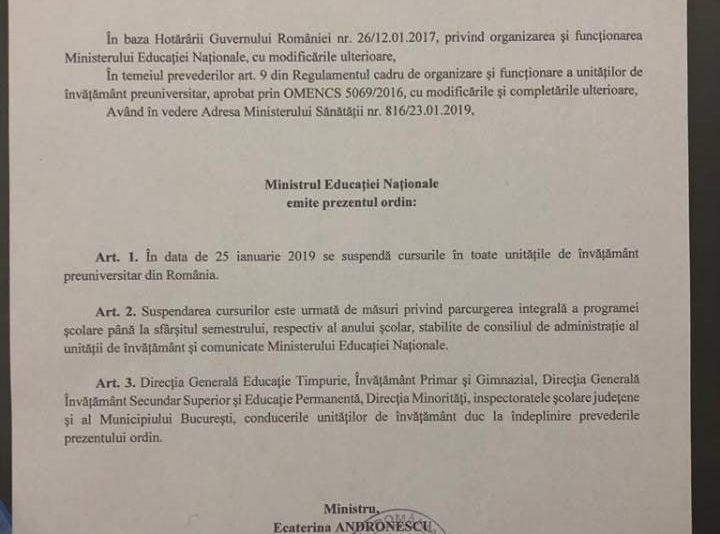 Şcolile şi grădiniţele din toată ţara vor fi închise şi vineri, pe 25 ianuarie. Prin urmare, elevii şi preşcolarii se vor mai bucura de încă o zi liberă. Cursurile au fost suspendate prin ordin semnat de ministrul Educaţiei Naţionale, Ecaterina Andronescu.