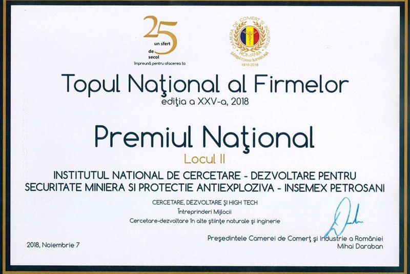 Pe baza unei metodologii complexe şi unitare la nivel naţional, prevăzută de lege şi implementată de fiecare Cameră de Comerţ la nivel de judeţ, Institutului Național de Cercetare – Dezvoltare pentru Securitate Minieră și Protecție Antiexplozivă - INSEMEX Petroșani i-a fost acordat Premiul II în domeniul de activitate ”Cercetare-Dezvoltare și High-Tech”, grupa „Cercetare-dezvoltare în alte ştiinţe naturale şi inginerie”, categoria „Întreprinderi mijlocii”.