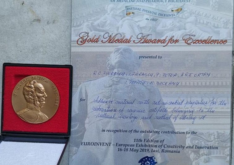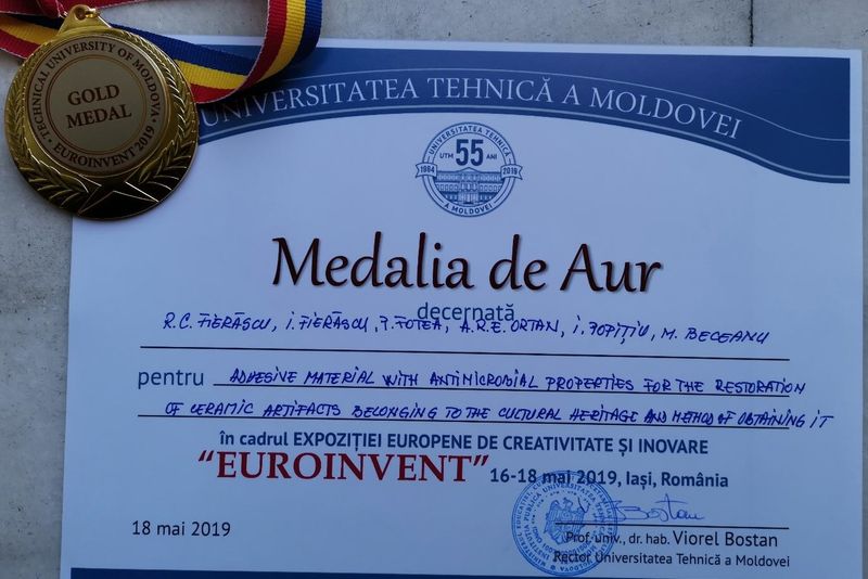 Este vorba despre un material de lipire cu proprietăți antimicrobiene pentru restaurarea de artefacte pe suport ceramic aparținând patrimoniului cultural, precum și a metodei de obținere a acesteia. „Prezenta invenție se referă la un material folosit în procesul de restaurare ceramică unde se utilizează numai materiale similare originalelor sau, dacă acest lucru nu este posibil, materiale cu proprietăți fizico-mecanice cât mai apropiate de materialele originale. Respectând regulile și principiile de restaurare și utilizând materiale cu toxicitate scăzută, s-a încercat să se creeze un material adeziv antimicrobian compus dintr-un adeziv polivinilic îmbogățit cu un amestec antimicrobian pentru restaurarea artefactelor de patrimoniu cultural ceramice și a altor materiale silicice”, explică reprezentanții MCDR Deva. Echipa care a conlucrat pentru sintetizarea acestui produs este formată din specialiști de la ICECHIM – Radu Claudiu Fierascu, Irina Fierascu, Petronela Fotea, USAMVB – Alina –Ruxandra-Eugenia Ortan, MCDR – Ioana Popitiu, Mihaela Beceanu.
