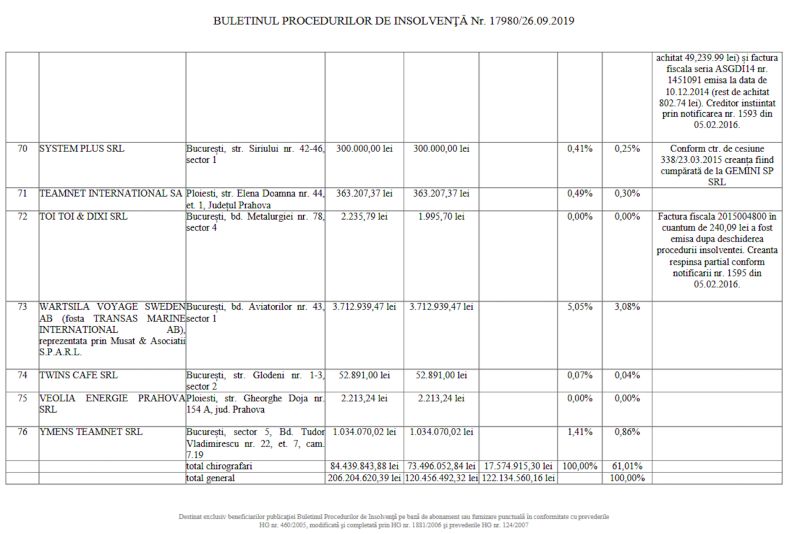Pe rând, Ghiță datorează bani pentru companiile ASESOFT INTERNATIONAL SA în cuantum de peste 206.200.000 lei, TEAMNET INTERNATIONAL SA în cuantum de peste 442.400.000 lei, INFRATEL NET SRL, în cuantum de peste 17.900.000 lei, 2K TELECOM SRL în cuantum de 395.472.034 lei, TVMP SRL, în cuantum de peste 660.000 lei.