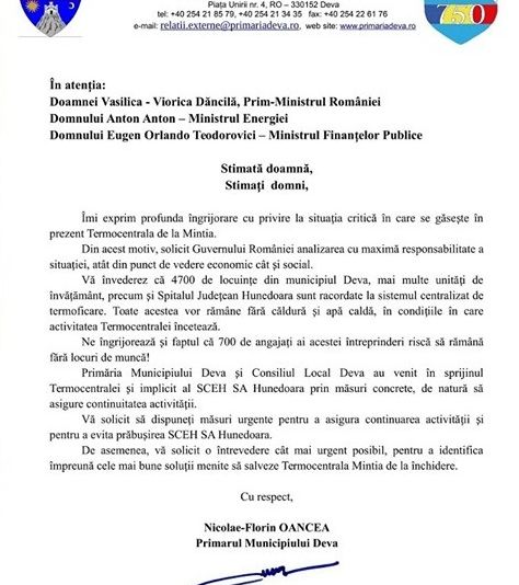 „Vă învederez că 4.700 de locuințe din municipiul Deva, mai multe unități de învățământ, precum și Spitalul Județean Hunedoara sunt racordate la sistemul centralizat de termoficare. Toate acestea vor rămâne fără căldură și apă caldă, în condițiile în care activitatea Termocentralei încetează. Ne îngrijorează și faptul că 700 de angajați ai acestei întreprinderi riscă să rămână fără locuri de muncă!Primăria Municipiului Deva și Consiliul Local Deva au venit în sprijinul Termocentralei și implicit al SCEH SA Hunedoara prin măsuri concrete, de natură să asigure continuitatea activității.Vă solicit să dispuneți măsuri urgente pentru a asigura continuarea activității și pentru a evita prăbușirea SCEH SA Hunedoara. De asemenea, vă solicit o întrevedere cât mai urgent posibil, pentru a identifica împreună cele mai bune soluții menite să salveze Termocentrala Mintia de la închidere”, scrie Florin Oancea, primarul municipiului Deva.