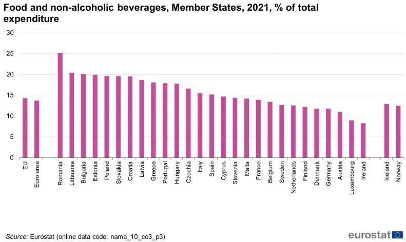 În ceea ce privește cheltuielile pentru “Alimente și băuturi nealcoolice”, cele mai mari ponderi au fost înregistrate în România (25,2 %), Lituania (20,4 %), Bulgaria (20,1 %) și Estonia (19,9 %), în timp ce cele mai mici ponderi au fost observate în Irlanda (8,3 %), Luxemburg (9,0 % ) și Austria (10,9 %).