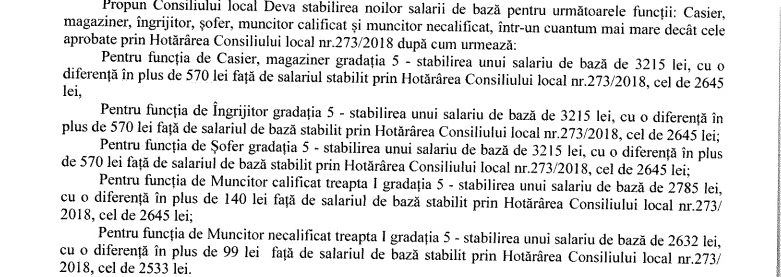 Propunerea de majorare a lefurilor a fost făcută „pentru a reduce diferenţele salariale între categoriile de angajaţi cu contract individual de muncă din aparatul de specialitate al primarului municipiului Deva” şi ţinând cont de faptul că „volumul activităţilor desfăşurate de personalul administrativ, de gospodărire, întreţinere -reparaţii şi de deservire, precum şi că responsabilităţile unor posturi, de exemplu, şofer, justifică acordarea unui salariu mai mare”, după cum se arată în proiectul de hotărâre ce urmează să fie supus aprobării în şedinţa CL Deva de miercuri, 31 octombrie.