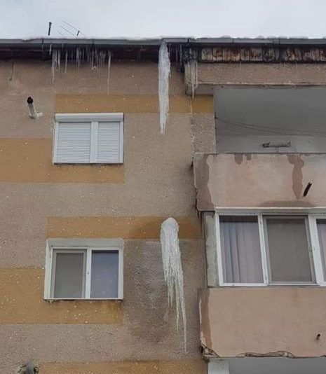 În urma căderii masive de zăpadă din ultimele zile, s-au format țurțuri de gheață de dimensiuni impresionante, pe streașina unor blocuri.