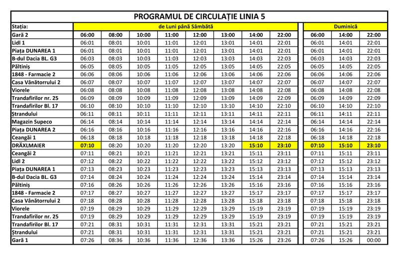 Astfel, autobuzele de pe noua linie vor pleca din gară, ajungând în cartierul Micro 7, de unde vor coborî la principalele supermarket-uri din oraș (Kaufland, Lidl, Supeco) și vor ajunge la Lisa Dräxlmaier, apoi vor întoarce la gară.Acestea sunt stațiile în care vor opri autobuzele de pe Linia 5:➡ Gară 2 ➡ Lidl 1 ➡ Piața Dunărea 1 ➡ Bd. Dacia Bl. G3 ➡ Păltiniș ➡ Bd. 1848 Farmacie 2 ➡ Casa Vânătorului 2 ➡ Viorele ➡ Trandafirilor 25 ➡ Trandafirilor Bl. 17 ➡ Ștrandului ➡ Supeco ➡ Piața Dunărea 2 ➡ Ceangăi 1 ➡ Dräxlmaier ➡ Ceangăi 2 ➡ Lidl 2 ➡ Piața Dunărea 1 ➡ Bd. Dacia Bl. G3 ➡ Păltiniș ➡ Bd. 1848 Farmacie 2 ➡ Casa Vânătorului 2 ➡ Viorele ➡ Trandafirilor 25 ➡ Trandafirilor Bl. 17 ➡ Ștrandului ➡ Gară 1