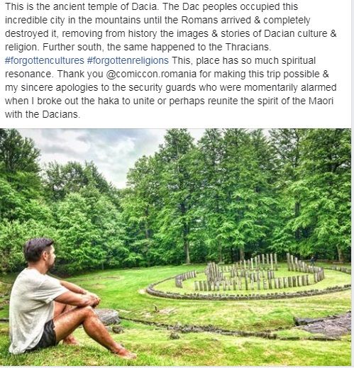 https://youtu.be/sNAVZP03JVQActorul și-a cerut scuze publice pentru gestul său, afirmând, într-un mesaj postat pe rețeaua de socializare, că a fost fascinat de acest enigmatic monument istoric, situat pe teritoriul județului Hunedoara. „Acesta este templul antic al Daciei. Poporul dac a ocupat acest oraș în munți până când romanii au sosit și l-au distrus complet, înlăturând din istorie imaginile și povestirile despre cultura și religia dacică. La sud, la fel s-a întâmplat și cu tracii. Acest loc are atât de multă rezonanță spirituală. Vă mulțumesc @comiccon.romania pentru că ați făcut posibilă această călătorie și scuzele mele sincere față de agenții de pază, care s-au alarmat pe moment când am izbucnit în Haka, pentru a uni sau poate pentru a reuni spiritul Maori cu Dacii”, a scris starul, pe Facebook, mesajul fiind însoțit de o fotografie în care apare la Sarmizegetusa Regia.