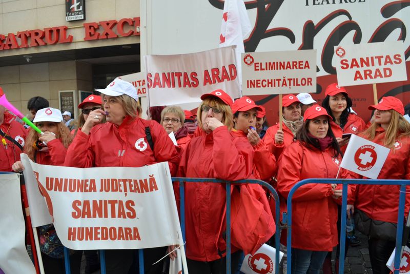 Sindicaliști de la „Sanitas” Hunedoara și-au cerut, astăzi, drepturile salariale în stradă, la București, alături de alți angajați din sistemul sanitar din țară.
