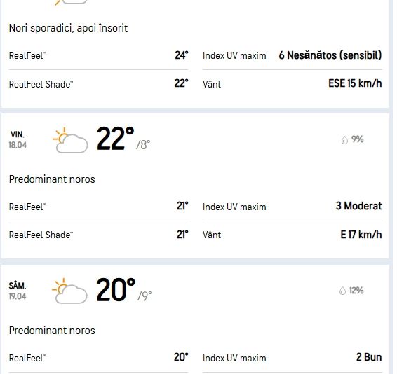 Meteorologii internaționali de la Accuweather prognozează de asemena vreme frumoasă pentru capitală în următoarele zile: