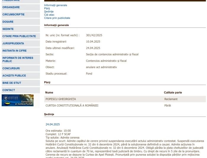 "Admite capatul de cerere privind suspendarea executarii actului administrativ contestat. Suspenda executarea Hotararii Curtii Constitutionale nr. 32 din 6 decembrie 2024, pana la solutionarea definitiva a cauzei. Admite actiunea in anulare. Anuleaza Hotararea Curtii Constitutionale nr. 32 din 6 decembrie 2024. Obliga parata la plata cheltuielilor de judecata catre reclamanta in cuantum de 70 lei, reprezentand taxa judiciara de timbru. Cu drept de recurs in 5 zile de la pronuntare. Cererea de recurs se depune la Curtea de Apel Ploiesti. Pronuntata prin punerea solutiei la dispozitia partilor prin mijlocirea grefei instantei azi, 24.04.2025”, se arată în minuta sentinței din dosarul nr. 301/42/2025, prezentată de Luju.ro.