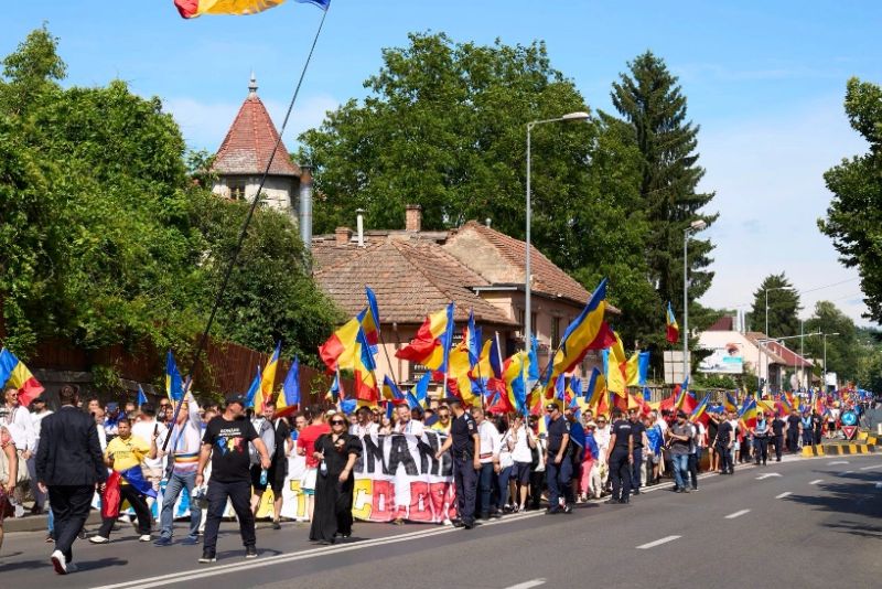 Liderul AUR Mureș, Răzvan Biro, a spus că la Sărbătoarea Drapelului, care a constat într-un marș prin Târgu Mureș și un spectacol folcloric participă 'câteva mii de persoane', din mai multe județe din țară.